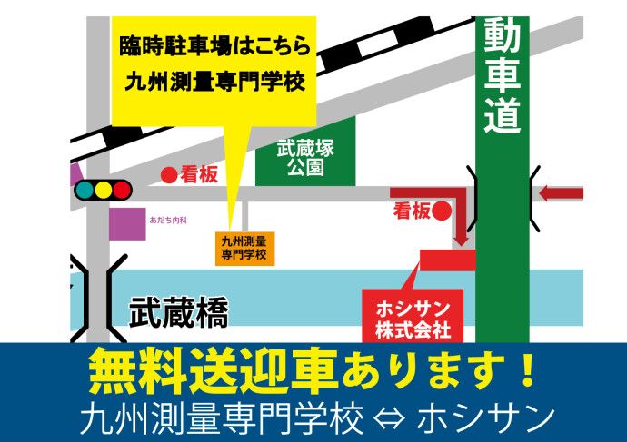 九州測量専門学校⇔ホシサン間に、無料送迎車もご用意しております。